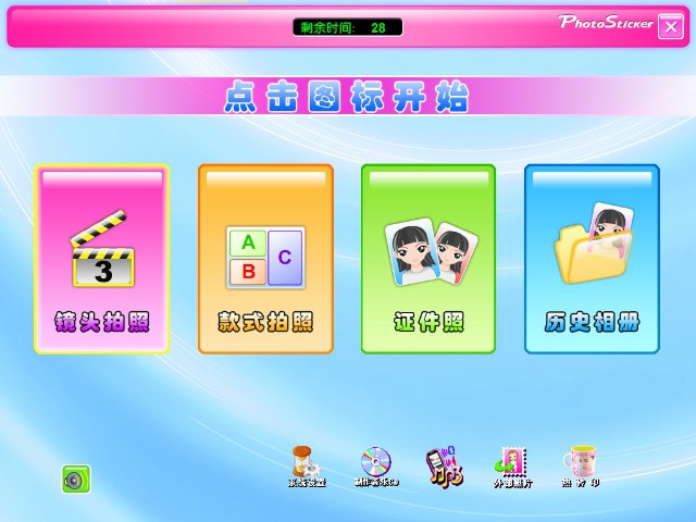 最常用的項目,點擊該大圖標按鈕后將首先選擇鏡頭數,確定鏡頭數量后進入拍照流程進行拍照、裝扮和打印等流程。