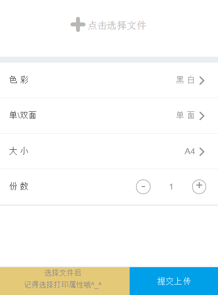 +點擊選擇文件,把手機保存的照片或者文檔,上傳,然后按照需求設(shè)置色彩、單雙面、份數(shù)。最后提交上傳