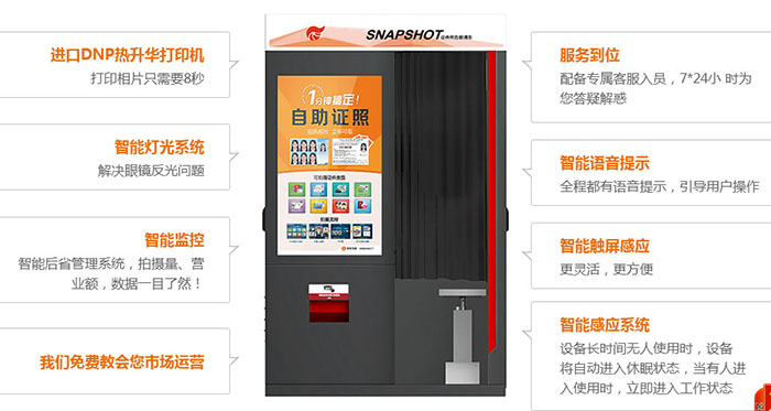 2、自助式證件照攝影系統(tǒng)是全自動運行的,24小時工作,無需有人值守,用戶可以自主完成照片的拍攝、指紋采集、繳費、照片打印,可以使用現(xiàn)金、支付寶、微信、銀聯(lián)進(jìn)行繳費。自助式證件照攝影系統(tǒng)操作簡單,全程都有語言提示。
