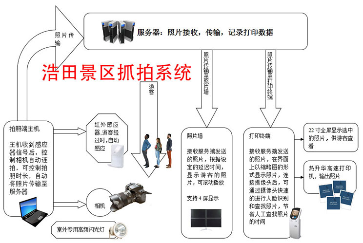1,自助打印,只要游客經(jīng)過(guò)特定區(qū)域,就會(huì)觸發(fā)拍照系統(tǒng)進(jìn)行快速抓拍。并上傳到云端,另一端實(shí)現(xiàn)自助打印。